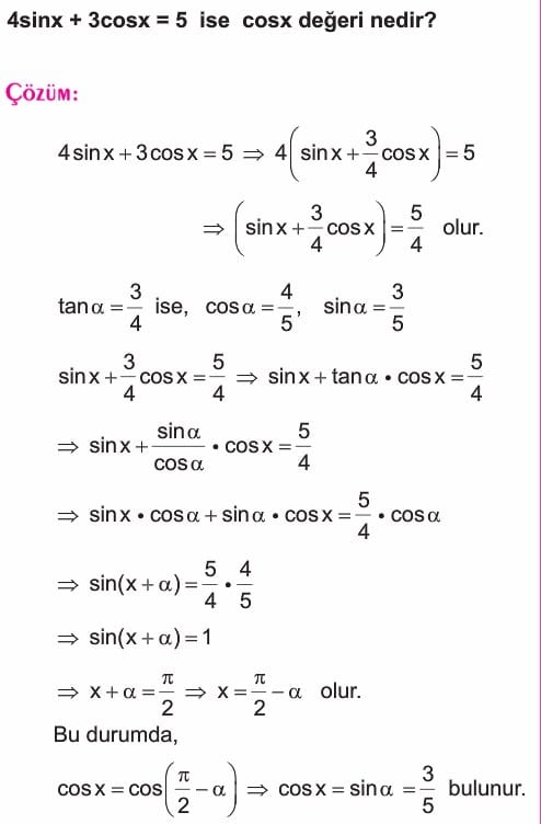 Denkleminin (0, π) aralığında 2 farklı kökü bulunur. Olmak üzere, a.sinx+b.cosx in alabileceği; İki açının sinüsü birbirine eşit ise ya bu iki açı aynıdır veya birine $360$ ın katlarını ekleyip çıkararak. Trigonometri kök bulma sorularında (salyangoz yöntemi) 6.video.