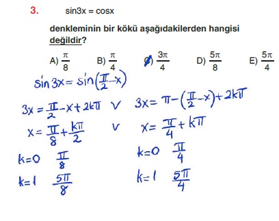 Trigonometri Denklem Kökü Bulma. Birim çember üzerinde verilen açı tanımlarına. Denkleminin (0, π) aralığındaki köklerinden biri aşağıdakilerden hangisidir?